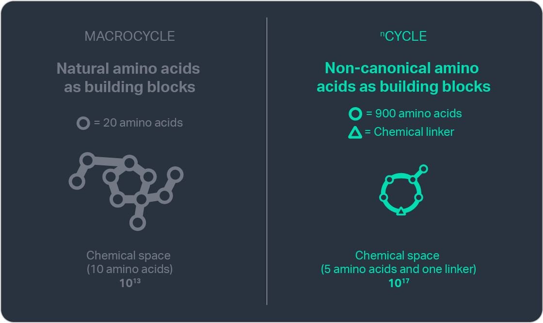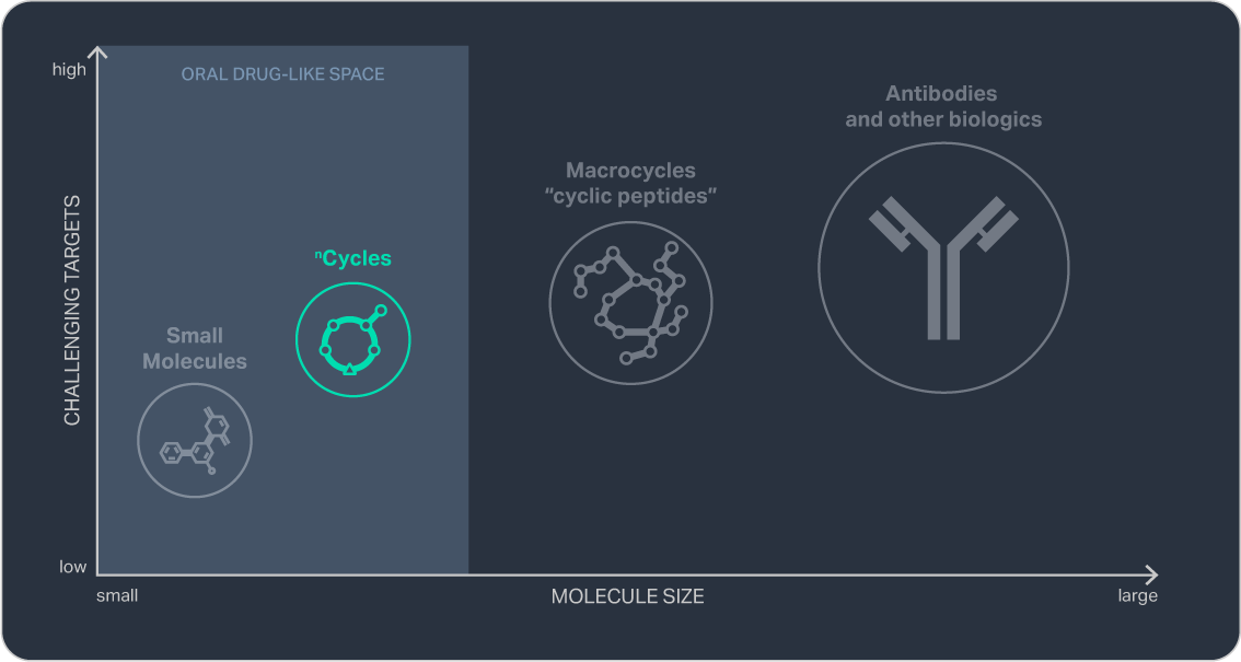 To enhance the therapeutic potential of macrocycles, we have designed nCycles — a new molecular class engineered for increased oral bioavailability by combining reduced size with expanded chemical diversity, including amino acids beyond those found in nature. nCycles can be manufactured much like small-molecule APIs, enabling bulk production through highly scalable processes with fast lead times and low cost of goods.